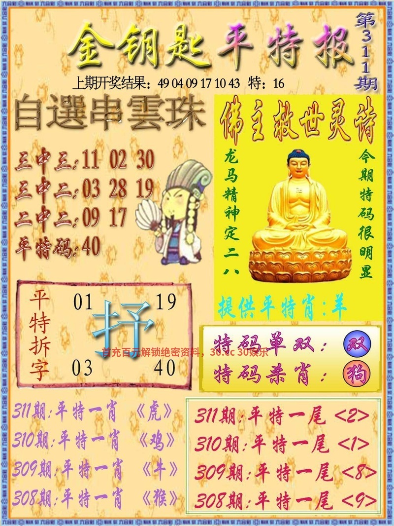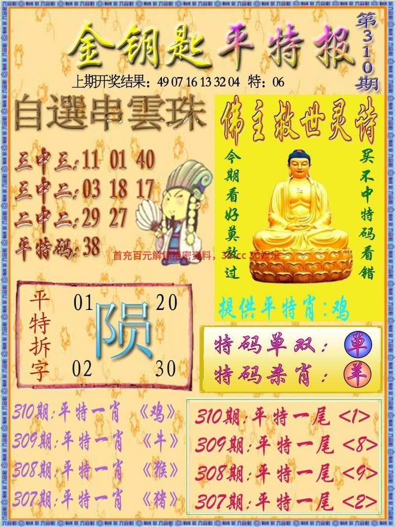 309期一字記曰:【睇】 机关算尽,坚决一心,揾食就要动脑筋 奇谋法宝,解数浑身,聪明自可睇得真 《榜》 解:揾食就要动脑筋解鼠猴蛇猪狗兔 综合取肖:鼠猴蛇猪狗兔 |